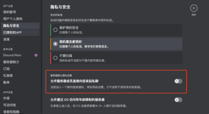 该选项如果打开的话,Discord的成员可以直接向你发起私聊,而这些成员的头像以及账号也许会与你在Discord里看到的管理员一模一样,这时你也许就会放松警惕而轻信这个账号,所以当他们发送某个链接给你的时候也许你就被钓鱼成功了。