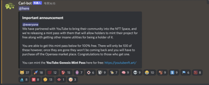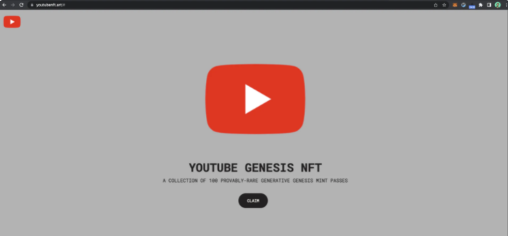 这个截图是OpenSea官方的Discord中的消息,大意是说OpenSea要和YouTube合作发行NFT,只有100个免费名额。小白用户看到这个消息可能立马FOMO了,点击截图中的链接后,看到的网站大概长这样。