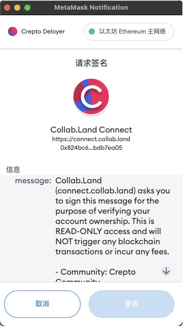 一般来说获取签名的目的是为了证明你拥有该钱包地址,例如Discord里有个叫Collabland的机器人,它就是通过签名来验证你拥有该钱包地址,并且该钱包地址上拥有该NFT,验证通过后就会给你一个Holder身份认证。