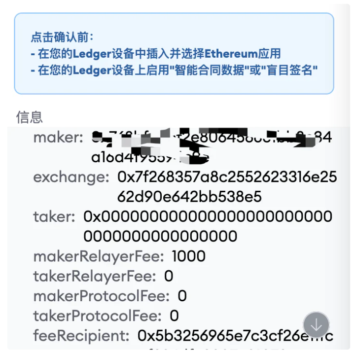 但如果大家看到的签名内容如上面这个截图,看不明白是什么,就别操作了。因为上面这个弹窗的签名内容是OpenSea的卖单签名,但卖单的价格可能被攻击者设置为0.001E,如果你不小心在钓鱼网站对此签名了,你的NFT可能就会被低价卖给钓鱼者。