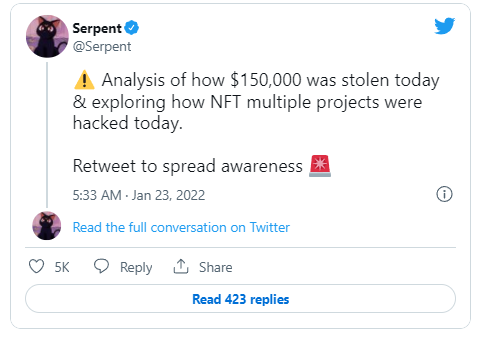 目前发现有针对于Discord管理者钓鱼的网站,管理者进入网站被引导后会让攻击者得到管理者的Discord session,攻击者利用session就可以绕开2FA及登陆验证,直接以管理员的身份接管Discord社区了。下面推文有详细分析,感兴趣的朋友可以看看。